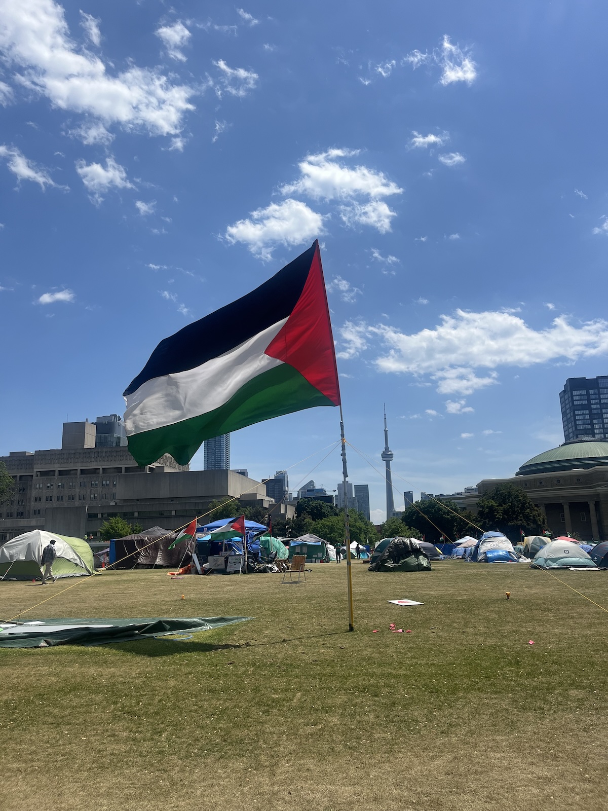 The most beautiful thing I saw in person this year were the encampments at the University of Toronto. The sky was so blue, like a matrix out of which University College, completed in 1859, had been etched. But the Romanesque revival of the university’s first permanent building, with its sturdy, thick brick walls and ornate arches, had nothing on the slight breeze making the flimsy graffitied tents shimmer. I saw “WE OUT HERE” painted onto a tent. If it had been in a museum, these words could have been both a title and the wall text announcing a diversity of practices: a creative-writing circle, a conversation about antiblack racism, restorative bodywork, movement, counseling. But this was more than a museum could ever be; this was life and death. At that particular hour, on an afternoon in May, it was quiet. I saw more tents than people, giving the atmosphere a sense of preparedness. More was coming. The people were getting ready. Looking south, Palestinian flags installed on the fences interrupted the Toronto skyline. I tried not to be romantic about all of the terrible beauty—but either way, it was fleeting. The art was there, and now it’s gone.