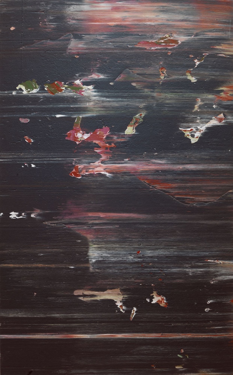 Other artists might have stopped there, content to have made one major innovation. But if one thing is made clear by the MoMA retrospective, it is that Whitten possessed an inextinguishable need to experiment. The third room in the exhibition shows the artist’s varied attempts to improvise anew in advance of a solo exhibition at the Whitney Museum of American Art in 1974. He placed “disruptors” such as stones and sheet metal on his canvases to interrupt the marks made by the Developer, while also speeding up his scrape: like a sprinter preparing for the Olympics, he reduced the time to a pat three seconds. Greater velocity created more spontaneous works. “The main thing is immediate raking, horizontal rakings,” Whitten wrote in the catalogue for the Whitney show. “They’re organized by chance. When I rake them in a split second, there’s no way of knowing.” By moving so quickly, he said, he hoped to “catch and freeze” something he would not be able to see until after the image was created.