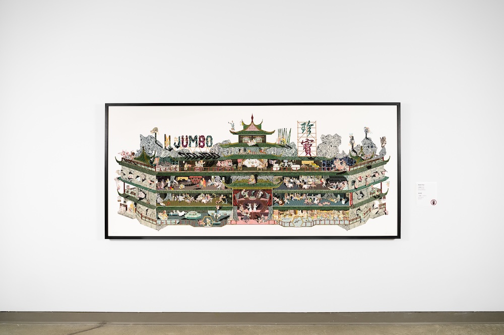 Tsui’s richly detailed etching Jumbo (2024) is inspired by the real-life Jumbo Floating Restaurant in Hong Kong, a landmark that opened in 1976 and literally sank in 2022, during the COVID-19 pandemic. In this work, viewers find characters from Qiu’s previous series woven seamlessly into the complex, surreal scenes that define Tsui’s narrative world. Jumbo, abundant in grotesque and surreal scenes, recalls the famed twelfth-century Japanese ink hand scroll Chōjū jinbutsu giga (Scrolls of animal-person caricatures). Tsui transformed the sunken boat into a living hell where humans and monsters chaotically coexist. Some figures have their heads split open and their brains exposed to the air, while others have bodies grotesquely twisted and contorted. In one corner, a group of figures is engaged in a sword fight, while in the next scene, a man is boiled in a large pot. Although Tsui’s rich, speculative work is rooted in the mythological past, he, too, tells visual stories with contemporary resonance, referencing recent events in Hong Kong.