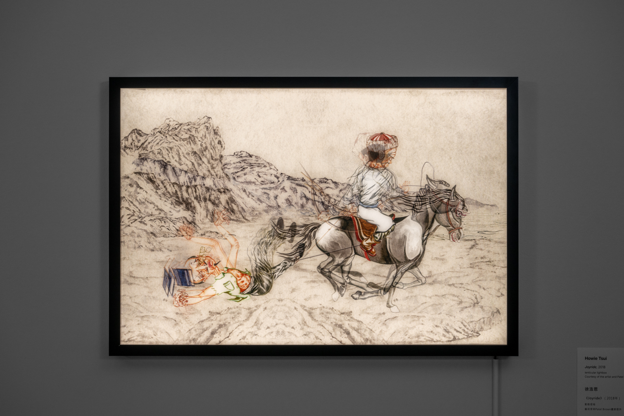 Wuxia fictions have become another focus of Tsui’s research in recent years. Named after wu (martial-arts skill) and xia (chivalrous virtue), wuxia narratives, which began gaining popularity in the early twentieth century, typically revolve around heroic martial artists whose extraordinary abilities propel the storyline. In Tsui’s Joyride (2018), a man resembling a scholar is dragged behind a horse ridden by an arrow-wielding warrior, while a mountainous ink landscape unfolds behind them. Joyride is a lenticular print on a light box, and so the scene shifts as the viewer moves, further amplifying the figures’ dramatic gestures.