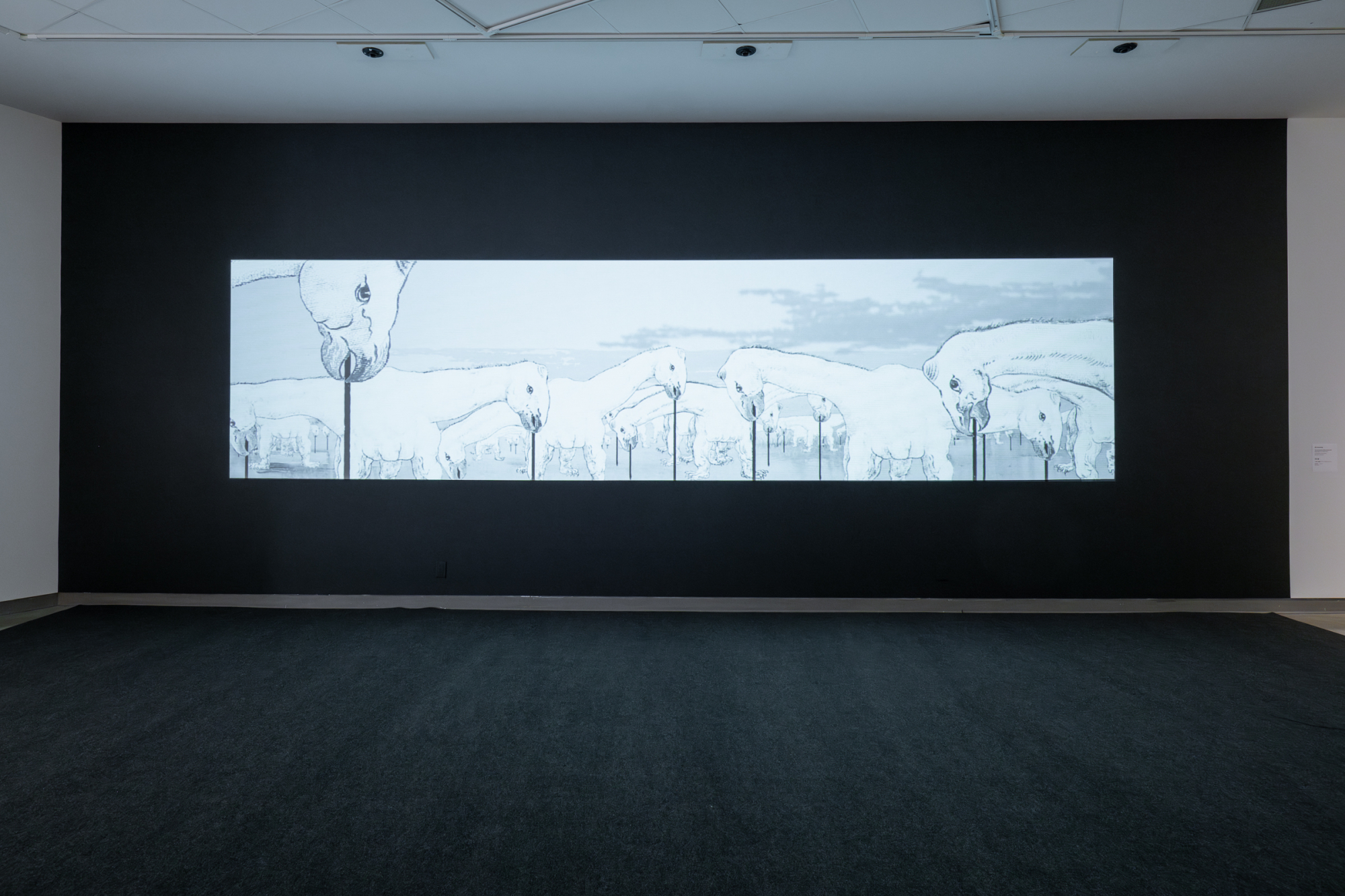 At the center of the gallery, Shanghai-based Qiu Anxiong’s ink-animation trilogy The New Book of Mountains and Seas Part 1–3 (2006–17) was projected against an entire wall. Qiu has spent the last two decades reinterpreting Chinese ink painting, using Chinese mythology and science fiction as the foundation for his artistic universe and fluidly connecting the two genres. As he puts it, “Science fiction is [the] mythology of nowadays.” So although Qiu’s trilogy draws inspiration from Shan hai jing (The Classic of Mountains and Seas)—a Chinese mytho-geographical compendium dating to the fourth century CE—the world he constructs is a near-future cyberpunk dystopia.