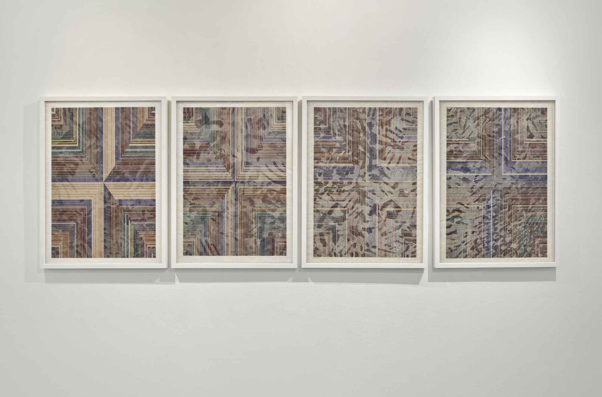 Dust Jacket builds on an already coherent body of work that is iterative, research-driven, and unusually linear. Even a quieter series like Tracks and traces and changes (Sand Prints) (2024), Garden-Smith’s documentation of found sidewalk imprints for the Goldfarb Gallery’s vitrine spaces at York University, returns to surfaces as records, and to pattern as a kind of timekeeper, gathering compression, pressure, and contact. This logic extends to the body of the viewer. In the exhibition’s title installation, a curtain of vertical blinds suspended just off the wall, extending floor to ceiling, was held a few inches into the room and across two walls. Each slat carried a marbled surface of drifting color, so that the image only cohered—and then fell apart—depending on where you stood. A wall-based work can be faced, but a curtain must be approached. It acts as both image and threshold. With the blind moving gently as I walked along its perimeter, I noticed something simultaneously delicate and infrastructural: the domestic inflated to encompass a striated weather system.