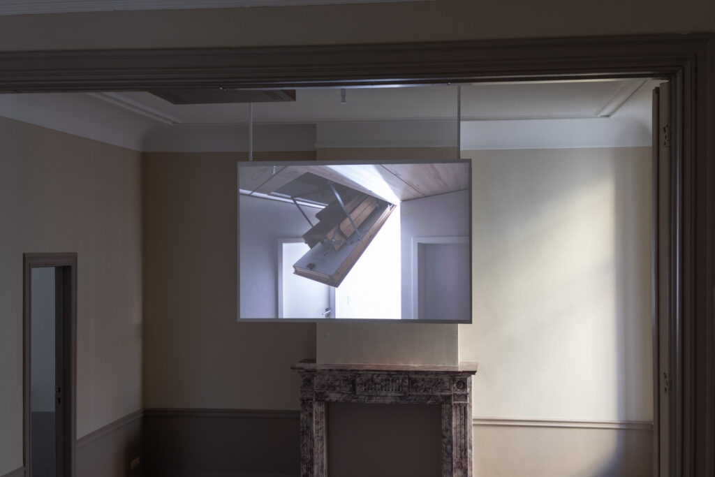 Two nearby films share this rhythmic meditation: First, a stop-motion slideshow that catalogs the mechanics of an attic trap door opening and closing, its descending ladder folding and unfolding (Untitled, Slideshow), is projected onto a screen suspended close to the ceiling. A fireplace—another kind of portal—is visible just behind the screen, within the film’s sight line. Schneider seems more interested here in conjuring an opening than in the slog of combing through the contents that lie beyond it. As the film’s central motion repeats, aberrance seeps in: Schneider has in fact photographed not one, but many attic trap doors, all operating within the nondescript aesthetic conditions of a middle-class northern European family home. Meticulously documented DIY design decisions—a slatted pine roof here, a special kind of hook there—reinforce the universality of seeking tidy solutions for stowing away emotions.