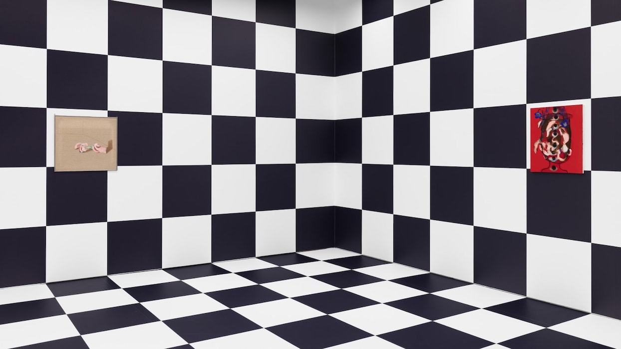 Another related concern seems to be breaking down the binary of horizontal and vertical, since the floor and the walls become, at least theoretically, one single plane. As we know, the deconstruction of any pair of opposites can be labeled ”queer” or ”subversive.” I’m not exactly sure what that means. Perhaps that Wellmann is struggling to justify to herself why she is a painter. (If there’s a sliver of this logic, I’d suggest she tweeze it out). But on a practical level, the brazen scenography makes it necessary to go very close to the paintings in order to see them properly; in order to stop the checkers forever flickering in your periphery, or the paintings getting lost to infinity. You’d think this might forge a different sense of intimacy with the works, but it doesn’t. You’re never alone with them, you never escape the checkers.