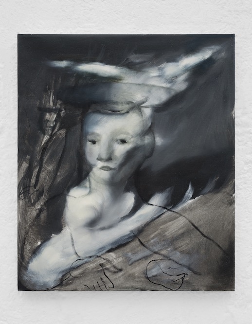 There are other such bulwarks inside the paintings. In Scissoring and Half-Mother (both 2020), cutouts of fleshy-looking bits on plain raw canvas deny us the satisfaction of indexicality and topicality. Equally in The Logic of Ghosts (2020) Wellmann undercuts her own technical virtuosity when a face of Rococo-like elegance is flanked by parts that seem purposefully, if not parodically, rough or silly (a little cartoonish face, hovering pointlessly), achieving spectral evasiveness by way of nonchalance. In Landscape with a Figure of a Woman, it is possible that she takes the strategy too far, as a lack of density and detail makes for an overall unconvincing impression – or that protection or resistance contain also an element of resting on one’s laurels. With Glance (2020), however, Wellmann hits the bullseye (or eyes): on a bright red background a vase full of messy lines we’ve learned to understand as limbs, two gas blue flowers, and a stack of eight eyes, as if stolen from a pack of Cyclops. Here the blockbuster porcelain effect and flesh whirls are employed to a fresher end, closer to abstraction, to confusion, to breaking free of topicality, but without sacrificing dynamism and intensity. With only one eye, a cyclops cannot see depth. But what about with eight? Infinite depth? Or would that be an overkill, a nightmarish aubergine check-pattern? At her best, Wellmann asks serious questions about painting simply by making a great painting.