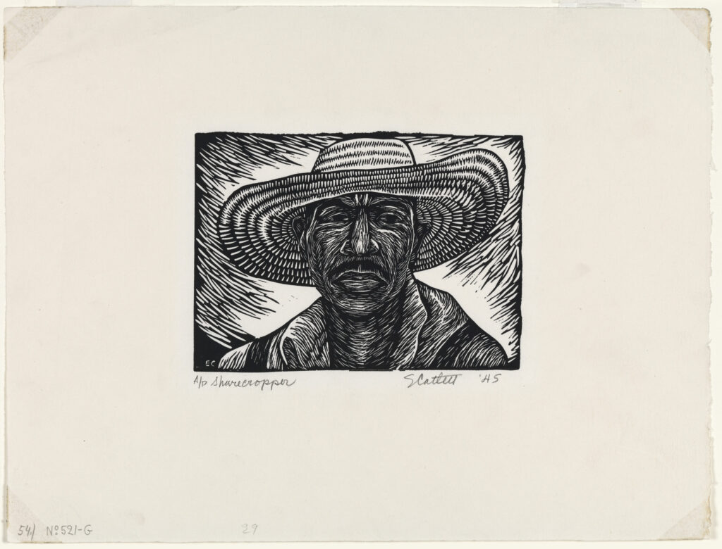 The gallery’s presentation extends from Catlett’s early education through to her time creating a vast collection of prints with Taller de Grafíca Popular (The People’s Graphic Workshop, or TGP). Returning to Mexico just months after her initial fellowship, Catlett became a member of TGP in the fall of 1946. The group organized around the core principle of making art for el pueblo, the working-class Indigenous peoples fighting for liberation from colonialism, capitalism, and racism. TGP became a political home for Catlett, a community where she believed her life’s work began. Emerging within a post-Revolutionary Mexico, these artists were committed to political and cultural independence from Spain, taking an educational, realist approach to their printmaking practice. Supporting the TGP in collective action and creative collaboration, Catlett made prints during this time that locate parallels between the struggles of rural Indigenous laborers in Mexico and civil-rights, Black feminist, and labor movements in the United States. Campesinos Mexicanos (1958) adorns her subjects with the same wide-brimmed straw hat as Sharecropper (male) (1945) and Sharecropper (1946). The prints seem to whisper: I see you. Your work matters. I recognize your brilliance.