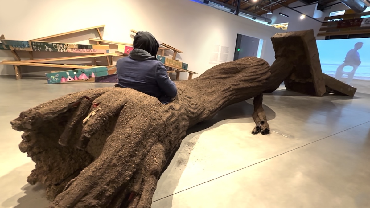 Given its surreal manifestation indoors, the tree appears like an unexpected dream. What to make of its twelve-meter length and the openings at either end—one at its root, smashed up against angled concrete slabs, and another branching into smaller limbs? At the exhibition’s opening performance, a woman occupied the hole nearest the branching end as if seated in a kayak. Her apparent merging with the tree embodied one idea insinuated by the work’s title, Universidad de la Tierra (University of the Earth, 2025): all living things connect through the land.