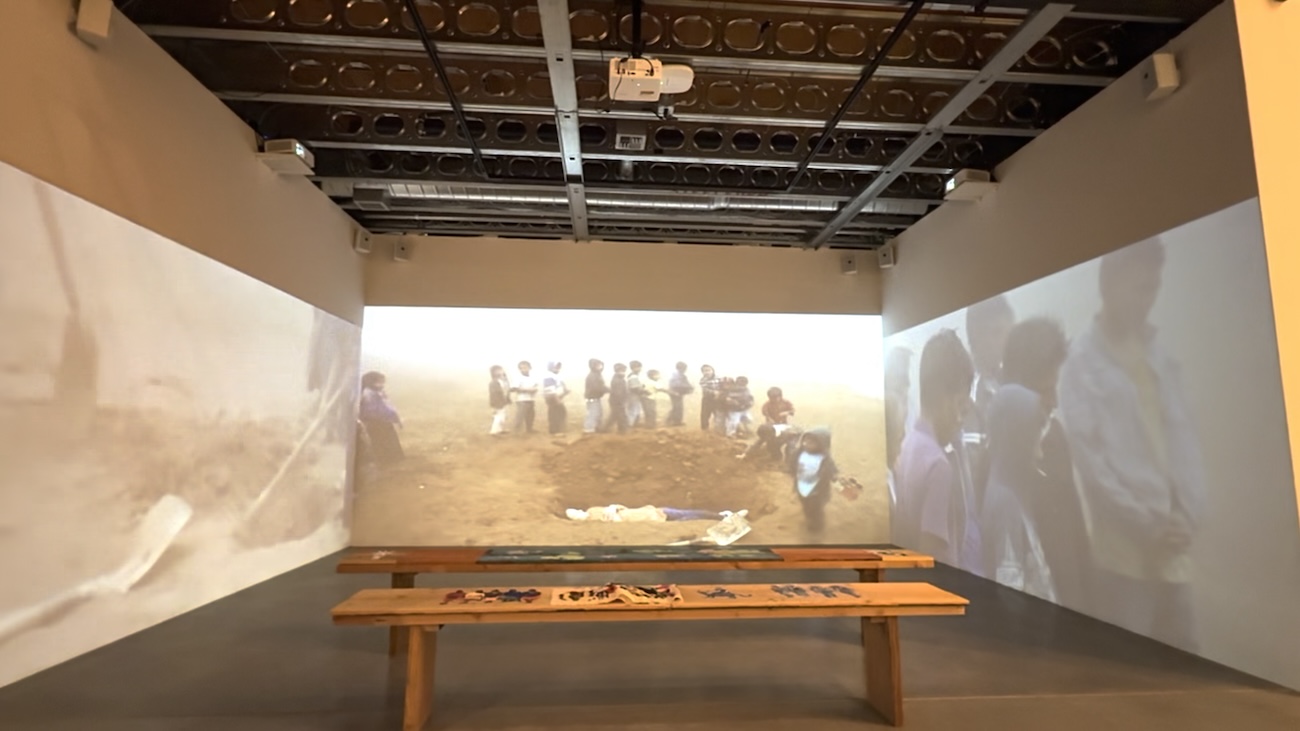 In a smaller theater constructed at the gallery’s rear, another set of videos plays simultaneously across three channels. In Chasing the Beast: Tijuana, Mexico (2021/2025), several individuals create models of homes they imagine living in, beyond their current bustling but resource-poor locale, which surrounds the viewer in the immersive setting. Carrying their creations in a casual street procession, they confront the border fence that prohibits them from pursuing their dreams, then set the models on fire.