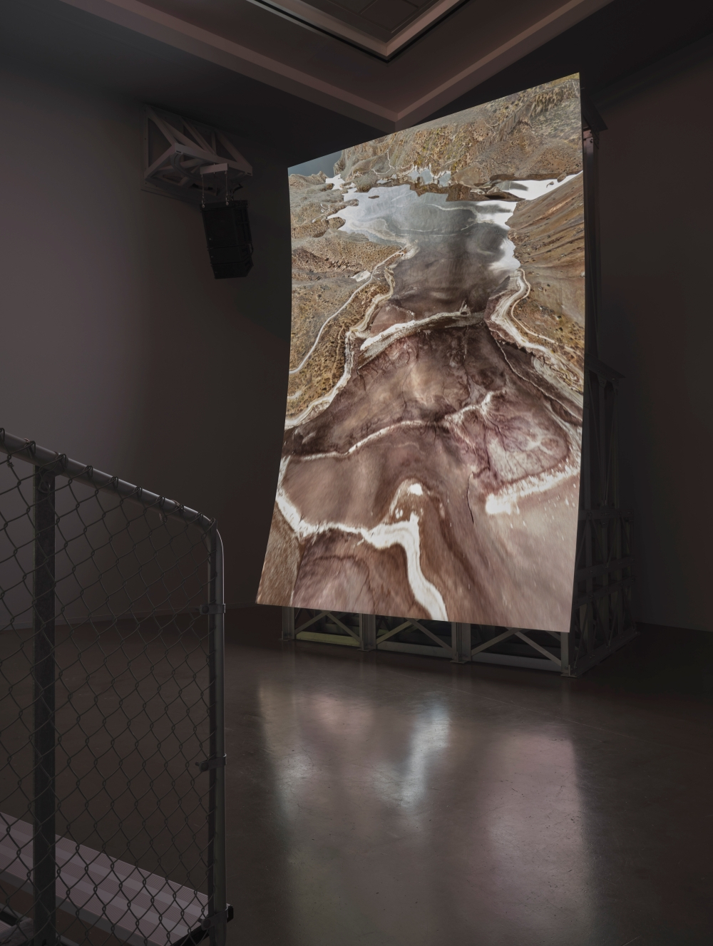 When the exhibition was first announced, Raven categorized the film Murderers Bar as a Western, referencing the genre better known for saloons and shootouts than experimental video art. Allusions to this cinematic style—and filmmaking in general—are subtle, but these references serve to ground the film’s jarring, digressive style within a more approachable rubric. Raven’s film is displayed on a curved vertical screen adjacent to metal stadium seating, a setup that recalls that of a traditional movie theater while deviating from its plush comforts. The looped film follows a kind of Mad Max–esque there-and-back quest narrative, beginning at one of the Klamath River’s four still-intact dams. Raven documents the dam’s dynamite-fueled breach, following its rush of water to the sea before returning the camera’s gaze back to the dam—a route that traverses the lands of Yurok, Karuk, Klamath, Shasta, and Hupa tribes. In this way, the camera’s path obliquely confronts some of the central problems in most frontier dramas. Murderers Bar skates across territory defined by cataclysmic—and deeply Western—clashes between humans, man-made technology, and nature.
