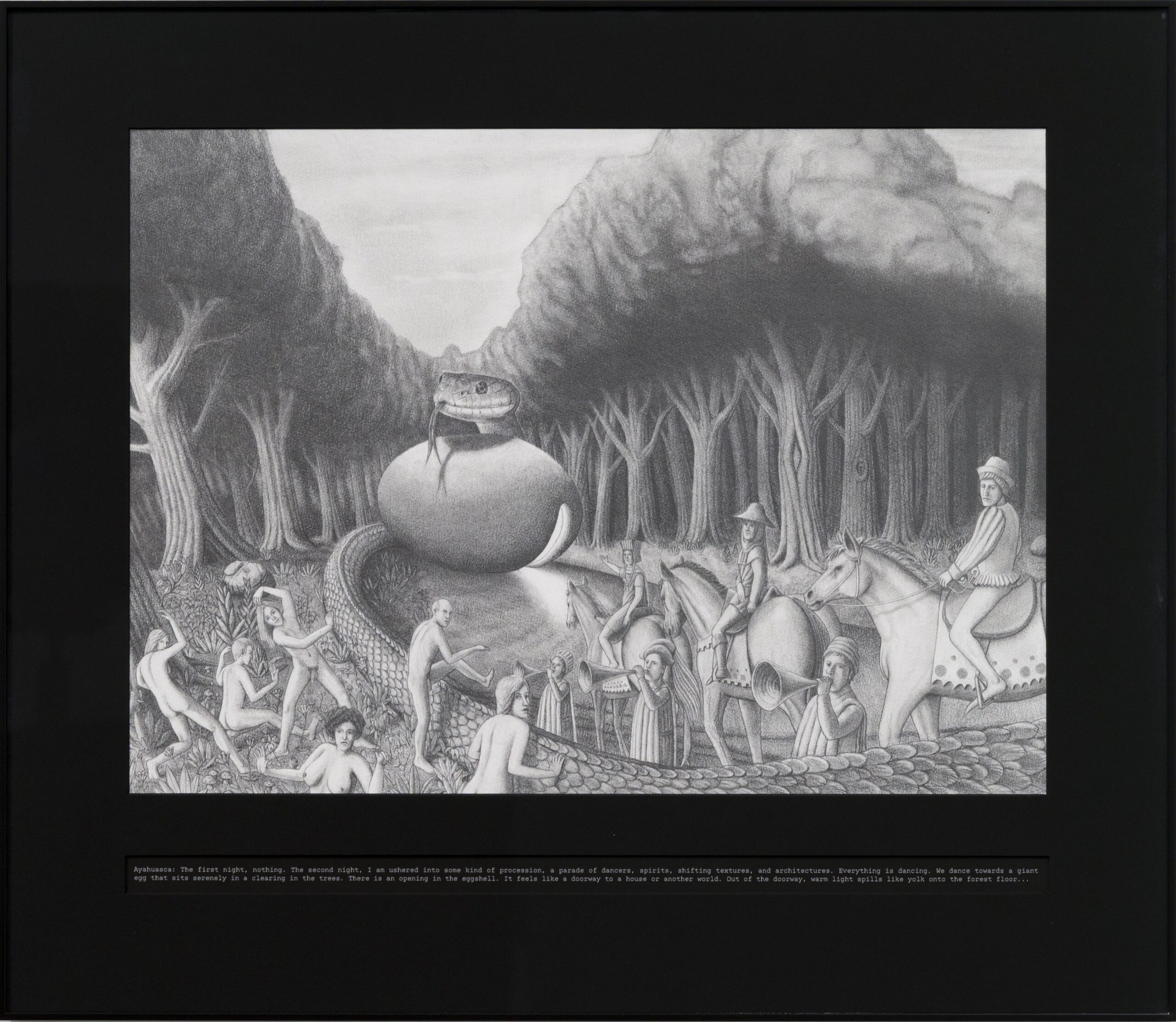 While Grieger’s and Nielsen’s paintings range in size from as small as a postcard to as large as Nielsen’s ten-foot-tall bear, Wilhite’s works are all around the same size, a little larger than an LP. All depict otherworldly and unnerving scenes, described in the artist’s laconic voice in paragraphs that appeared below the images. The first words of each caption double as each piece’s title. In My father has been kidnapped and held for ransom . . . (2020), a recognizable Wilhite père is enchanted into a bottle by cavorting goblins. In Ayahuasca: The first night, nothing. The second night, I am ushered into some kind of procession, a parade . . . (2021), a motley, somewhat Boschian crowd approaches an egg-shaped dwelling guarded by a massive snake. If Nielsen’s and Grieger’s works offer glimpses at—and visitors from—the unknown, potentially malevolent world motivating and inspiring the exhibition, Wilhite’s images offer something more like a lifestream from within this realm: a place, Bob Wilhite seems to suggest with his curation, from which a deep well of meaningful inspiration may course through Los Angeles artists. The show revered and celebrated mystery, recommending it be handled with care.