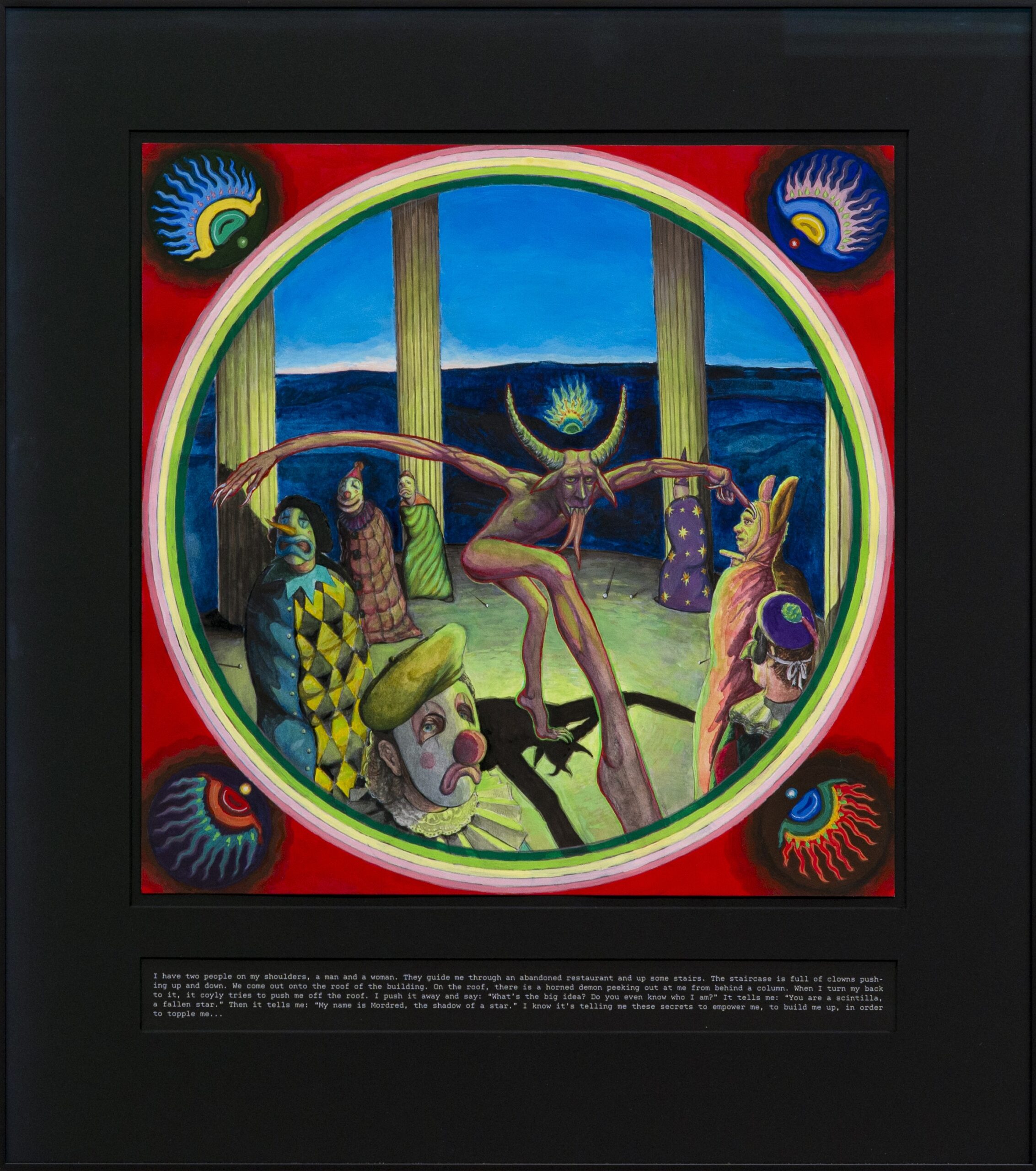 Axel Wilhite’s drawings brought to mind particularly odd yet somehow domestically familiar children’s book illustrations, along with a host of other influences. Most evident, and surprising, to me were the connections between the younger Wilhite’s work—presented as straightforward depictions of his dreams and visions—and the work of midcentury artists and LA underground forebears such as Marjorie Cameron, whose Peyote Vision (1955) so upset the Los Angeles Police Department that it shut Ferus Gallery on a charge of lewdness for including the drawing in a 1957 exhibition. With its lurid framing and color, an acrylic by Wilhite titled It says it’s telling me these secret truths to empower me, to build me up higher, so that it hurts more when it topples me . . . (2022), struck me as ideal for inclusion in a Crowleyian grimoire. In the painting, a demon lopes in the center of a circle of clowns and a crouching wizard with his back turned to us. The figures peer over their shoulders at the viewer, beckoning, challenging. But where Cameron had the benefit—and/or demerit—of the notoriously male-dominated Ordo Templi Orientis chapter in Los Angeles, Wilhite works alone. As he writes in his summary below the painting: “It tells me, ‘you are a scintilla, a fallen star.’ Then it tells me: ‘My name is Mordred, the shadow of a star.’” Perhaps these images and stories reflect a unique subject position, sharing with the viewer what it is like to be born and raised within the universe of unconscious images and forces that this exhibition summons with its spell.