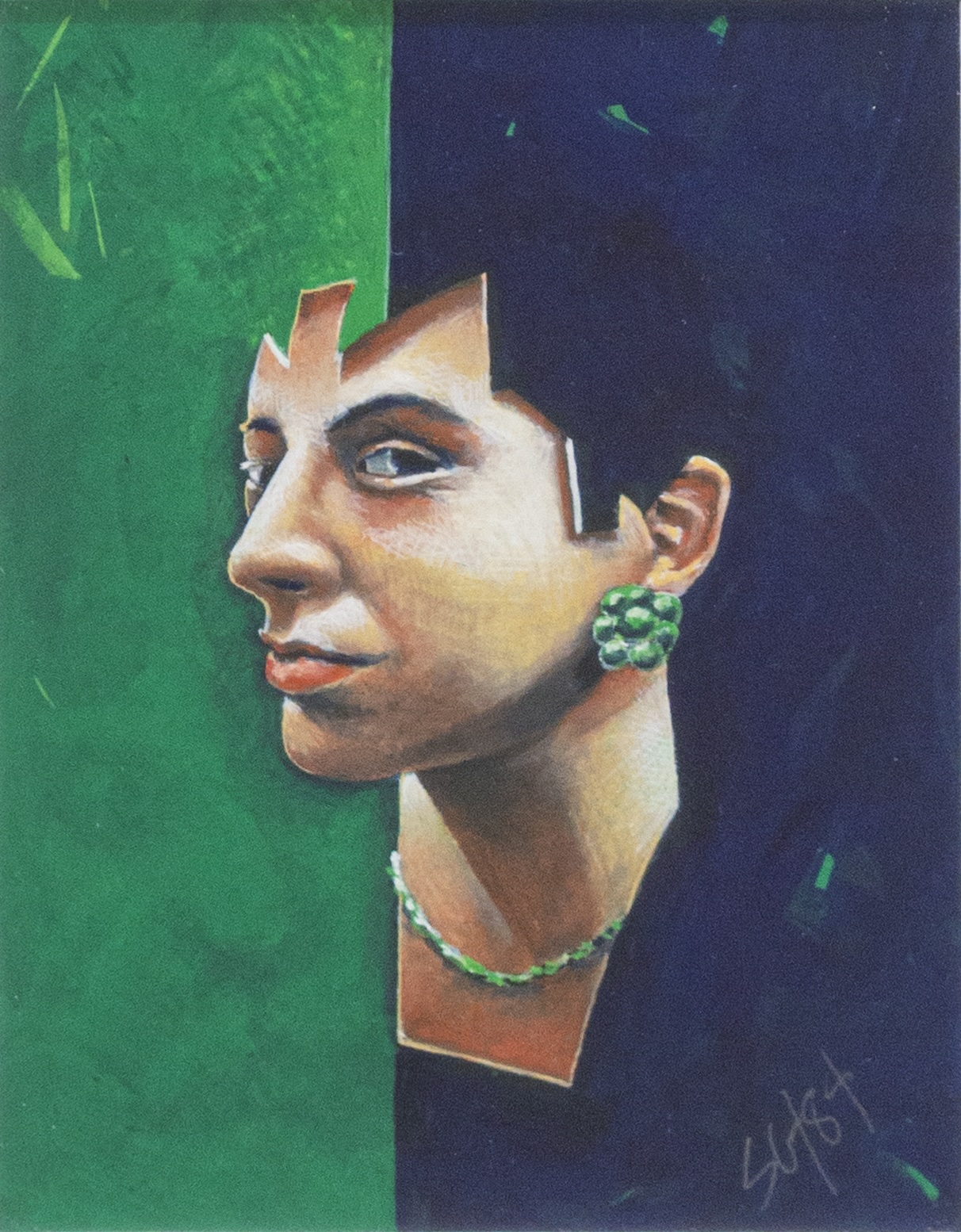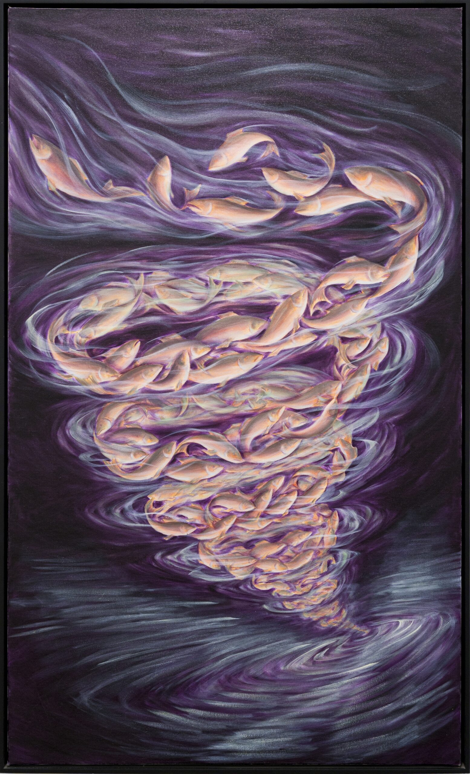 Of Grieger’s included works, LISA (1984) held the greatest feeling for me. In it, a woman’s face emerges from a bisected background, unequal parts navy and a jade green matched by her earrings and necklace. Its energy recalled the late Venice restaurant Hal’s Bar and Grill, which offered an impressive art collection, booths upholstered in a similar green, and a great burger. Grieger’s tiny faces peer out of his canvases, suggesting entire lives packed into tight confines—the figure in FRANK Stein (1985) is purse-lipped and pale-faced as Robert Blake as the Mystery Man in David Lynch’s Lost Highway; Margie S. (1985), laughing, leans over, her hair cut away in right-angle chunks, leaving only her mannequin-like disembodied head. Mischievous, maybe dangerous, maybe divine, these paintings were surrounded by white space in a room that held them like a cell. By contrast, Nielsen’s work, larger scale and more unpredictable, took the viewer out of the city and into the wild, with a compelling and archly American sense of the unknown animating her large and small canvases. Paintings such as Regeneration (2006)—a disconcerting tornado of luminous fish—suggest an irresistible grandeur that beckons and frightens all at once.