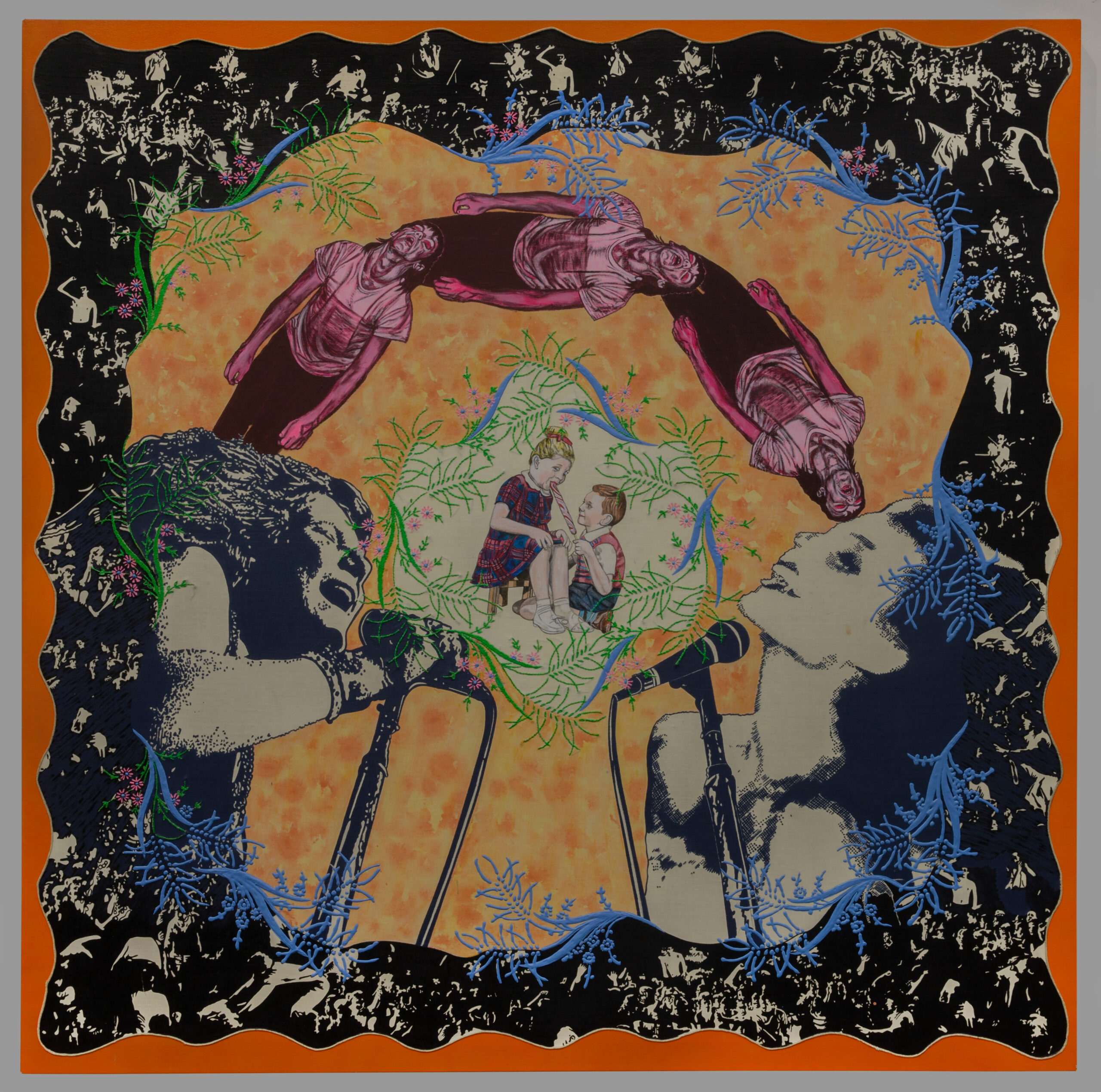 Besides flowers, guns are the most prominent visual motifs throughout the series of paintings. In Mister, You’ve Been Framed (1998), Caroompas playfully uses hot-pink pieces of tape, which might have scrappily held together a do-it-yourself punk-rock zine, as the image’s literal framework. Meanwhile, a disquieting scene unfolds: a woman points a gun at a man, the sucker who’s just been framed. It could be a typical pastoral embroidered scene were it not for the raging mosh pit appearing below the figures. Caroompas’s Heathcliffs and femme fatales are always caught in the fraught seconds before hesitations become actions, as if the clock were about to strike before high noon. In her painting The Honeysuckle Embraces the Thorn, a man and a woman, lusciously enclosed by all that embroidery, look askance at each other in a fun-house mirror, as though waiting for the other to blink first before making a move. When that move finally happens, maybe it will change everything, exploding the ingrained binaries we all intuitively understand.