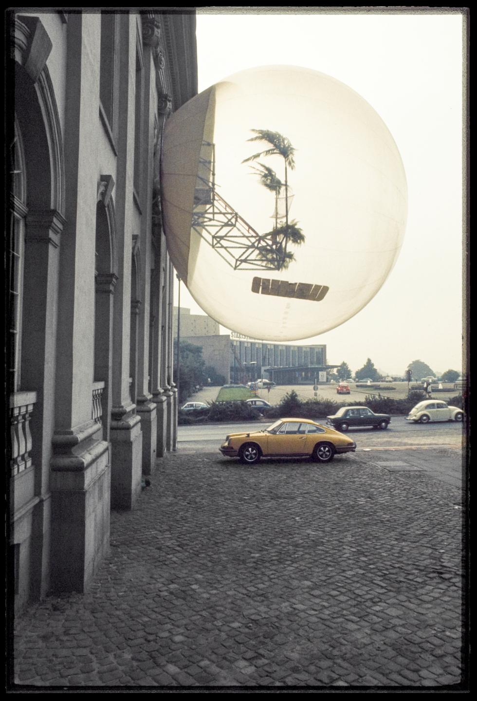 Szeemann’s first major post-Bern undertaking, documenta 5 in Kassel, Germany, included many of the same (mostly male) artists from Attitudes. He wanted to orchestrate a 100-day art “event,” not a temporary museum, as he believed past iterations of documenta had been. A black-and-white photograph at the Getty shows James Lee Byars standing on the roof of the 18th-century Fridericianum, calling out common German first names: a mundane action as spectacle. In another photo, a balloon by architecture firm Haus-Rucker-Co expands out from a window, with a tree and ladder enclosed inside. But becoming a free agent did not liberate Szeemann from controversy. A trio of letters in one vitrine tells the story of a confusing scandal that preceded the show’s opening. A letter purportedly from Szeemann, about the relative absence of female artists, reads: “The whores were at it again. […] I give the orders. Women should make soup, that’s all.” Lucy Lippard, who actually had made supper for Szeemann the year before and gave him a list of female artists to consider, angrily responded: “We gave you a short list knowing perfectly well that you would not visit more than a token number. You failed to do even that.” Jon Hendricks and John Toche of the Guerilla Art Action Group wrote, “WE REFUSE TO ACCEPT THE VICIOUS MENTAL ATTITUDES OF THIS SEXIST NATIONALISTIC LETTER.” Then, a few weeks later, Hendricks and Toche admitted to forging the original letter from Szeemann to “bring attention to the sexism of [documenta 5’s] organizers.” Eventually, Szeemann sent Lippard a passive-aggressive reply: “I beg your pardon for all the time you had to spend in my company.” After documenta, the curator decided to retreat. The show “had been brutal,” he told Obrist in 1995.