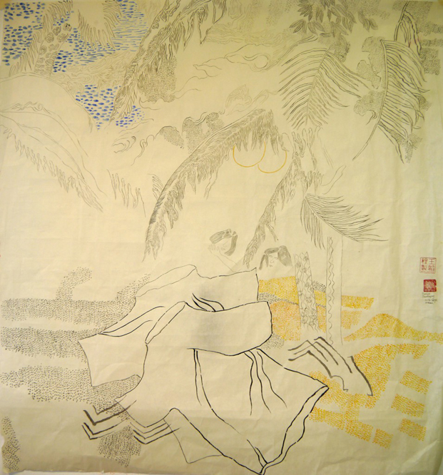 The drawings situate scenes in what the painter Mary Heilmann has described as “Asian space … where you have deep space – sort of Renaissance perspective – and then you also have abstract marks painted flat on the canvas.” The drawings themselves graft together Los Angeles clichés and hallucinations. Landscape of LA 1 (2016), a square panel on rice paper, is dappled with dots of ocean blue in the top left corner and pointillist specks of red and orange in the bottom right. Languorous palm fronds droop along the top perimeter and two round fruits are delineated in gold. Two faces, one without eyes, appear in the center. A disembodied forearm tenderly reaches for a chin. Landscape’s companion, Fantasy of Collar (2016), depicts a similarly dreamy scene, punctuated with plump nightshades, dark spiny leaves, and impressions of women with rippling crimson and sun-colored tresses. More cerulean freckles mingle around inky grey pools that bloom across the surface. These complexly-overlapped signifiers of place and history recall the fraught encounters of her Amsterdam parlor.