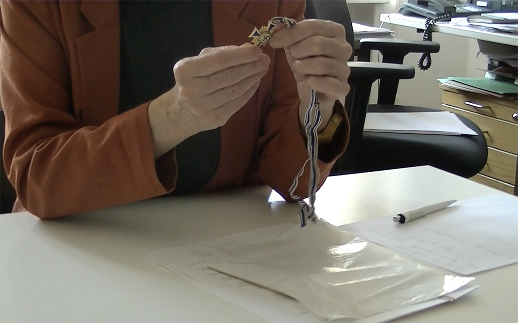 I planned to present a tripartite constellation of elements comprising a video, a letter, and a displacement. The video was recorded as an interview with Dr. Gerner and her colleagues holding various Nazi artifacts possessed by the museum. In it she describes the provenance and importance of each item, in what context they have been or could be displayed, and what the museum does not know about each one. The artifacts include an opera program from the time, daintily embossed with emblems of the Third Reich, which contains a text on the relevance of the opera to the ambitions of the Reich; a “Mutterkreuz” (Cross of Honour of the German Mother) given to women who bore numerous Aryan babies; a book of children’s songs, etc. Dr. Gerner outlines how most of the objects in the collection arrive there by donation and how their precise histories are often unknown. For her, keeping and displaying these items serves to educate – which, she asserted, was a political end in itself.