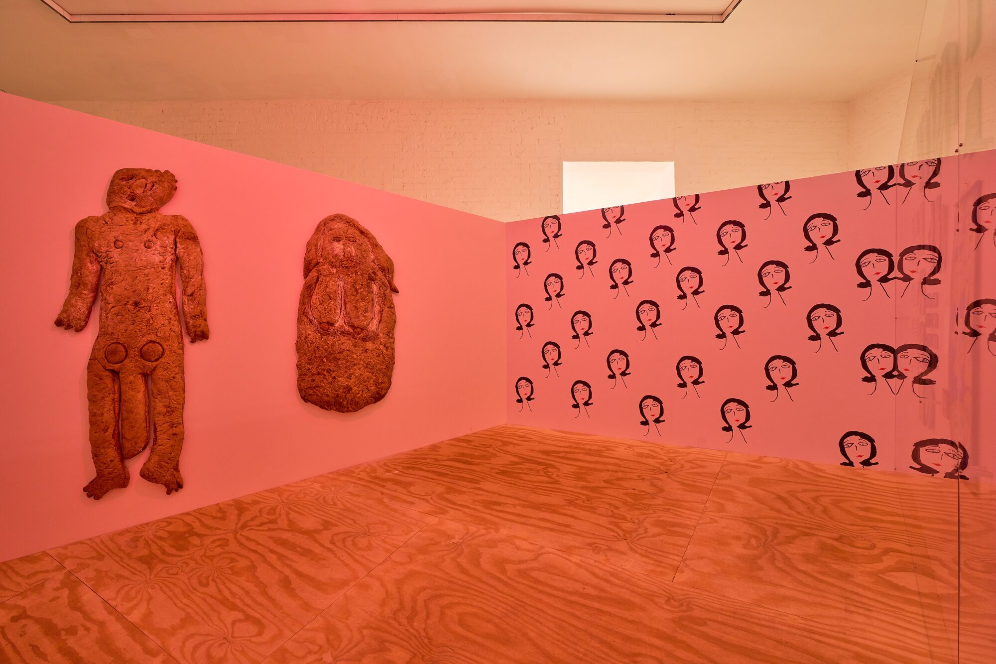 Davis used to print her zines at her office job at UCLA (her boss was Bob Locklear—yes, Heather’s father!) and threw stapling parties at her apartment. The artist credits her resourceful, DIY approach to art-making to her mother, Mary Magdalene Duplantier, who did not consider herself an artist yet was always making things from everyday household supplies. In this spirit, in the 1980s, Davis operated an art gallery out of her Sunset Boulevard apartment, the footprint of which is reproduced at MoMA PS1 as a tilted Ames room and titled HAG—small, contemporary, haggard (2012). You share the inside of the structure with life-size incarnations of Justin Timberlake and Mariah Carey molded—kneaded?—from sourdough, along with portraits Davis made of her personal lodestars like Pearl Bailey and Ingeborg Bachmann, painted on flyers, hotel napkins, and flattened cereal boxes with discounted or discontinued lipsticks, mascara, and eyeliner pencils.