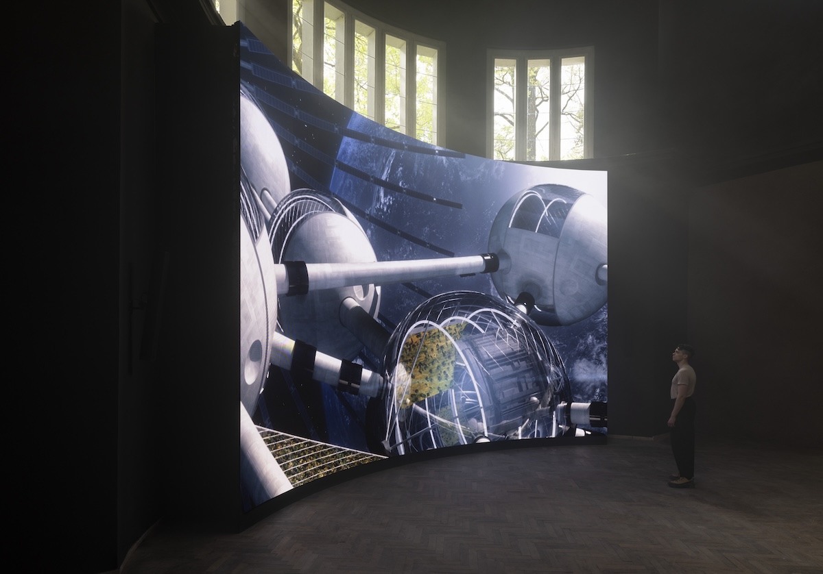 When Bartana represented Poland at the 54th Venice Biennale in 2011, she showed her trilogy of films titled … And Europe Will Be Stunned (2007–11), which revolves around the fictional Jewish Renaissance Movement in Poland (JRMiP) that advocates for three million Jews to return to Poland. Now, thirteen years later, she offers a galactic solution to the “Jewish question” by envisioning a generation ship named Light to the Nations (also the name of the 2022–24 body of work) that will transport Jews to outer space. Bartana’s proposition of Jewish interstellar travel is as absurd and provocative as her establishment of the JRMiP; however, while the former mourns the loss of Jewish life in Poland by calling for a restoration of the Polish Jewish population to its pre-Holocaust numbers, the latter suggests a complete departure from Earth—a chilling notion, especially within the context of the German pavilion. A large sculpture of the spaceship hangs, suspended from the walls and ceiling, near the pavilion’s entrance. Dramatically lit, it is modeled after the Kabbalistic sefirot diagram and features ten glowing spheres connected by intersecting beams. It reappears as a CGI animation in the video Farewell, floating through a galaxy and captured from multiple perspectives, evoking the epic grandeur of a Star Wars scene. The video’s narrative is elusive, but according to the curator’s statement, the strong young dancers anticipate their entry onto the ship through their synchronized movements. Clad in white dresses, they appear in an open field beneath a full moon, their arms raised, ritualistically gesturing toward the night sky. In another scene, the dancers, arranged in a circle, appear in a forest surrounded by twinkling light; they seem transparent, like ghosts, until they gradually vanish completely. Although their actual mounting of the ship is never shown, a sequence of large, all-caps words reads “FAREWELL” in English, Hebrew, German, and Italian.