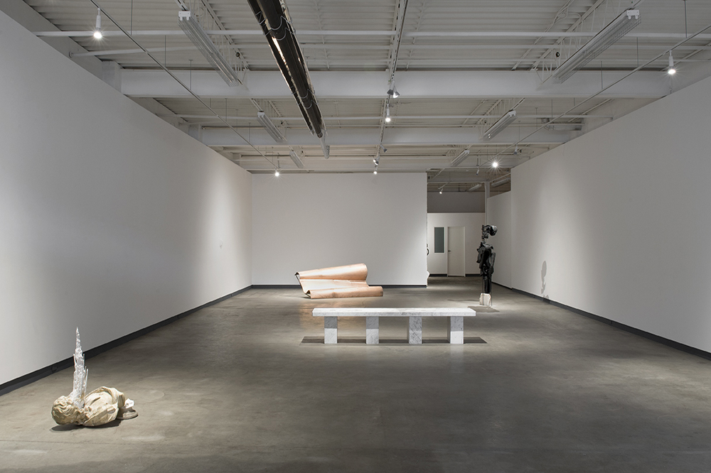 One of Jason de Haan’s salt-bearded heroes is fallen and protruding from the floor, nearby. The story behind this individual piece makes De Haan’s name-making work newly meaningful: from his series Salt Beards (2009-2014) – where the artist found plaster busts and then altered their visage by producing mineral deposits (like those found in caves) on their faces, effecting, drip by drip, over the course of hundreds of hours, extreme protrusions that form something like beards – this particular sculpture suffered a recent break that separates it from the assembly. The salt-water accrual on the lower half of this particular bust’s face became so heavy that it knocked the sculpture off its plinth, amazingly not breaking the “beard,” but severing its head from its neck. Since the bust in question is that of Isaac Newton, found in the same area that the Rip Van Winkle story is set (a man who fell asleep under a tree for decades, eventually awakening to a white beard and a new, unfamiliar world), the sculpture’s fracture signals a kind of metaphor for a reality that’s at once age-old and new, and enduringly unbearable. De Haan, for all his recent showings, has never felt so sage, and occult.