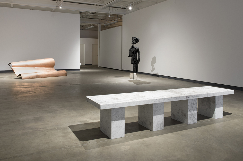 The exhibition’s centerpiece, however, is achieved in a marble bench that affects an important selvage within the gallery’s curatorial layout. Democratically presenting history’s banalities, persistence, and unremarked romances, Shannon Bool has made a marble bench marked by the re-created inscriptions of a half-century’s casual graffiti artists. Referencing the scale of the original fifteen benches that surround Florence’s Piazzale Michelangelo (whose piazza, built in 1869, is legacy to an urban renewal plan, initiated by the emergence of the middle class), she reproduces a single bench and subverts the original directive to Michelangelo’s work by focusing our attention on the piazza and its people. The marble bears the markings of over fifty years of graffiti, featuring now-outdated Italian slang, tourist inscriptions, and lovers’ signatures. As the curatorial text aptly remarks, the bench “simultaneously bears and collapses multiple histories.” It’s a testament to a public’s palimpsest. The refrain “I was here” echoes its pithy assertion through stone, making it grand; making, as so many nothings do, history.