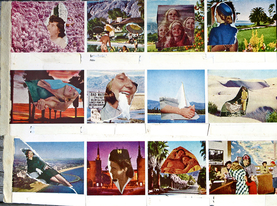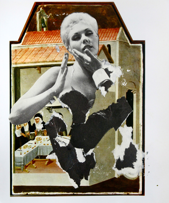 With such maneuvers, Maddin nudges us to contemplate the changing paradigm of image distribution – “How ponderous it must have been, to turn a page!” – though mainly these paper antiquities serve as set pieces for the show’s nostalgic drama. In a series of grouped collages that Maddin terms storyboards, he evokes the 1960s North American bourgeoisie, happily banging out the baby boomer generation behind the scenes, and otherwise fomenting tourism with their big smiles and jumper dresses. Under vitrines, we find another series disporting cultural icons of the period, like Kim Novak and Jackie Kennedy, mounted atop Renaissance religious paintings.
