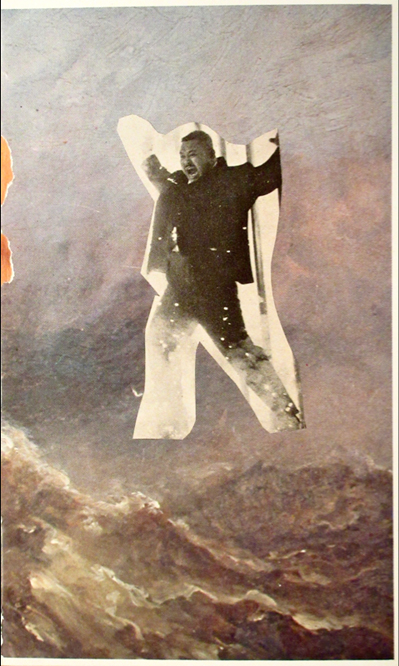 Works like this one will make you feel smart because they’re so intelligible. The trick is keeping things simple. Maddin rarely reaches far for his collages. Like Untitled (Rainbow), most of his pieces consist of two distinct images, one a character and the other a setting, divided into foreground and background, and arranged in a straightforward, balanced composition. In his interview with Leach, he calls this strategy a “bad habit,” but I prefer its directness to the alternative. What could be worse than collage that’s full of striving?