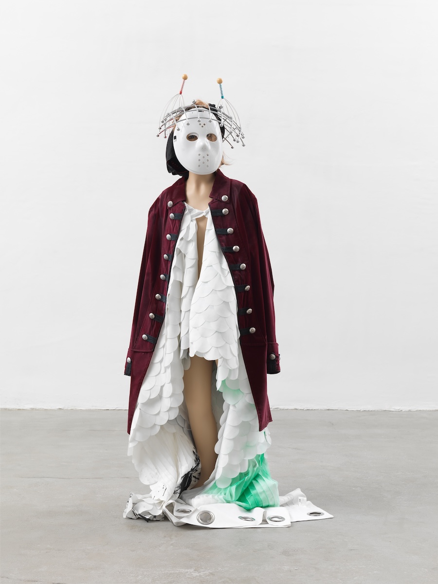 Genzken takes us into a different, anthropomorphic direction with her Schauspieler (Actors) series (2013–16). Genzken uses commercial mannequins that she dresses with her personal pieces of clothing, to humanize them. These actors are not the ready-mades of old. Dressed to seem human, in eerie masks and gloves, they are individualized but nonetheless styled to be off-putting. The effect is enhanced in the space they occupy: if the light of day touches their skin just so, we are forced to take a step back, to escape their threatening monstrosity. They voice the fear of encroaching onto someone else’s personal space, which, in the past few years, has become pathologically concrete. Although silent and unmoving, the Schauspieler work the same chilling effect on me as Disneylands’ Audio-Animatronics in its Pirates of the Caribbean ride. This is one of Genzken’s strengths: creating a cinematic vibe out of the purely static.