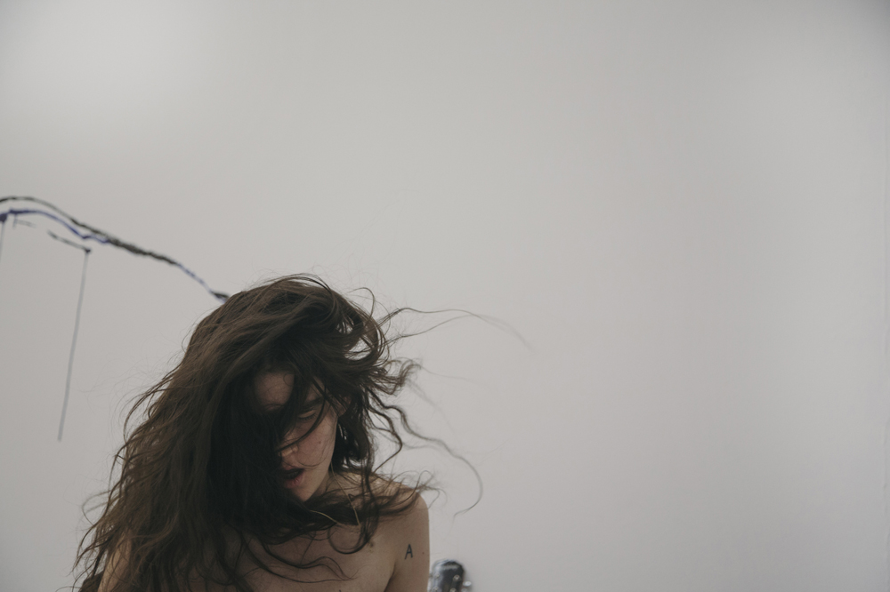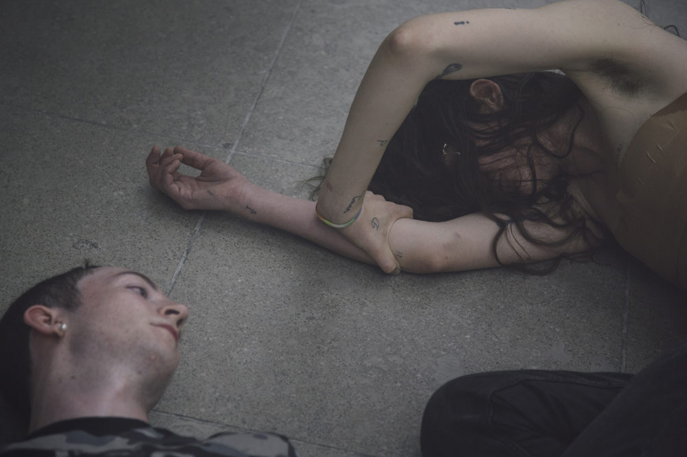 Tense musical registers reinforce the images, and are interspersed with low, choral chants. A few of the performers have microphones taped to the crooks of their arms, like IV drips of sound; they sing into their elbows as if gently nursing a wound. Lyrics rhyming tragic and lovesick penetrate the room from suspended speakers. At times, when the pathos becomes particularly performative, it’s even funny; the way you might laugh at memories of your own teenage angst, despite or in recognition of its near-fatal gravity in the moment. The performers are not teenagers, however, and an implicit commentary on extended adolescence is legible. The critique is a structural one, though, leveled not at individuals but at the socio-economic reality fueling a mass epidemic of anxiety and depression.