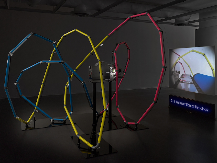 Camera Path / Film Path with under-titles—which had its first installation at InterAccess Gallery in Toronto, and is now on view at the Art Gallery of Greater Victoria—is simultaneously a film, a math problem, and a 3D model that contains its own critical interpretation. It comprises a 35mm film projection produced from the surface of the path of the film strip as it moves through a coiled, rollercoaster-like sculpture, which itself is the three-dimensional materialization of the film loop, and installed as an tangle around the projector. Comprising vibrant cyan, magenta, yellow, and pure black steel and aluminum armatures, the sculpture is a granny knot that folds back into itself to create a set of circuitous rings through which the film strip can pass. Young & Giroux collaborated with Daniel Hambleton of MESH Consultants in Toronto to devise the three-dimensional actualization of their initial concept sketches. Camera Path / Film Path with under-titles is a double visualization of a singular idea, a tautological device, a way of saying the same thing twice. What we see on the screen is the film as it flows through the sculpture, tracked by the omnipresent camera.