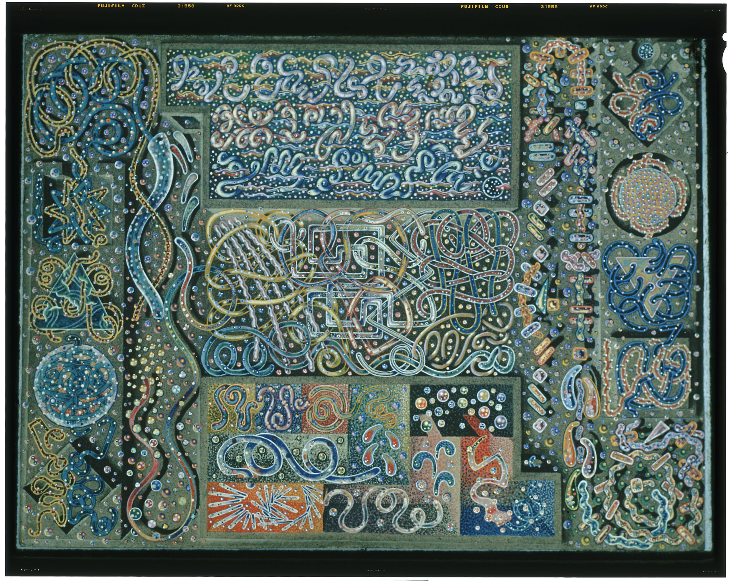 When you first walk into Fragments of a Faith Forgotten: The Art of Harry Smith at the Whitney Museum, you’re greeted by Andy Warhol’s black-and-white film portrait of Smith, whose long fingers are pulling threads into cat’s cradle formations, his eyes eerily magnified by his large glasses. Cat’s cradle patterns, made by looping lengths of string into geometric shapes, are linked to various spiritual practices and storytelling traditions; upon his death, Smith left behind an unfinished, thousand-page manuscript on the subject. The relationships between games, chance, and divination weave throughout his life’s work. In his various roles as occultist, music historian, filmmaker, artist, paper-airplane and painted-egg collector, cat’s cradle researcher, alchemist in residence, and consecrated Gnostic bishop, Harry Smith was relentless in his search for patterns and parallels. He moved between drawing, recording, painting, and filmmaking, all while using divination and automatic techniques to rearrange his chaotic revelations into art. “I tried as much as possible to make the whole thing automatic, the production automatic rather than any kind of logical process,” he said in a 1965 interview with Film Culture Reader, explaining that because everything has a cosmic rhythm, he didn’t need to impose his own. Smith would edit his films live and then throw them under buses, torch his paintings, drop his poems out of windows, eventually destroying most of his work. He was notoriously elliptical and obnoxious during formal interviews and changed biographical details constantly. The patterns he uncovered don’t help us to find a soothing, intellectual cosmic order. In his work, patterns, textures, colors, mediums, and methods constantly rearrange themselves, annihilating and creating other orders. The effect brings us to the furthest edges of our awareness, pulling us beyond intellectual knowledge toward the irrational, intuitive, emotional parts of ourselves that might be more at home with mystery. His work invites us to contemplate the shifting conditions of life by plunging in and joining the dance.