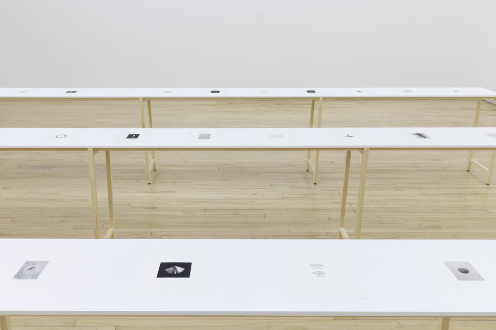 Nearly a year later, in April 2015, Jodoin opened a solo exhibition at Battat Contemporary, une certaine instabilité émotionnelle, that included an open-ended series of works on paper, both abstract and representational, in addition to a sound-text piece. At the outset, the show seemed like a return to representation from Jodoin’s previous interest in abstract collage. However, she is quick to point out that she has always made abstraction as a means to think through her decision-making process. Her various series, she notes, are made concurrently over the process of many years and developed in dialogue with one another. The “in-between” nature of the drawings in the most recent exhibition is particularly interesting in reference to what came before. The new work invites us to consider the relationship between representation and abstraction, as well as process and completion. Placed side by side on long tables spanning the gallery, the works exist more like specimens on an examination table. They are small, black-and-white images, less like drawings and more like objects carefully placed on pristine sheets of paper. There is an encyclopaedic breadth to their content and style of depiction. From scientific diagrams to smudged charcoal, they indiscriminately mix visual vocabularies, presenting them in a database format. In isolation, the works feel decontextualized and abstracted. Together, they form the evidence of a person’s life – a proposal for one narrative amongst many.