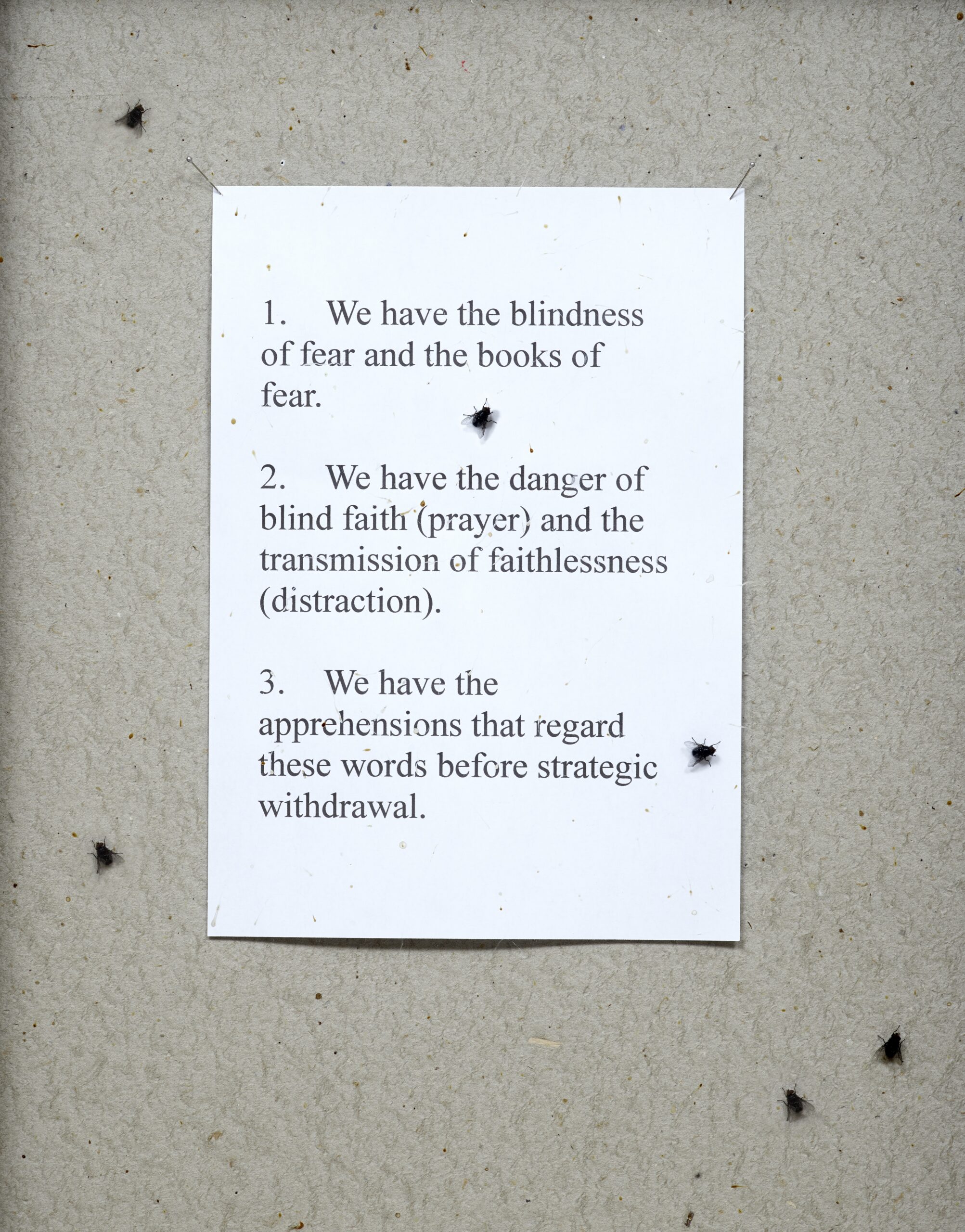 At Whitechapel, before each person entered the room with the sculpture Transmission (1990), a gallery attendant offered them a pair of nondescript safety glasses meant to shield their eyes from ultraviolet rays. Inside, viewers were lured to a circle of glowing objects on the floor. The objects, nine glass books emitting a clinical blue light, each rested on what is meant to resemble a Quran stand. The books are inscribed with drawings of a triffid—a fictional and carnivorous plant from John Wyndham’s science-fiction novel The Day of the Triffids (Michael Joseph, 1951). The triffids are noticeably phallic-shaped; in the novel, they are described as an invasive and foreign species whose poisonous touch kills instantly. As visitors circled the installation, they encountered each book’s sequentially turned pages, though the final open book, pressed nearly flush against the wall, was inaccessible. Near the room’s entrance, on a wall facing the radiating books, was a glass display case—like one would find in a church hallway—labeled with the word TRANSMISSION in gold, administrative lettering. The case contained texts on paper treated with a sugar solution, as well as fly pupae that hatched, fed on the paper, and died over the course of the exhibition. This piece is a recreation of Butt’s original, which was destroyed by the artist after Damien Hirst’s conspicuous plagiarism of it in his sculpture A Thousand Years (1990), in which flies are bred inside a clear vitrine that also includes a rotting cow’s head and an insect electrocutor. The provocation of Hirst’s sculpture lies not in the demand that its concept might have on the spectator but in its impulse for subversion: Spectators are meant to feel disgust at, or perhaps pleasure in, the spectacle of the flies’ execution.