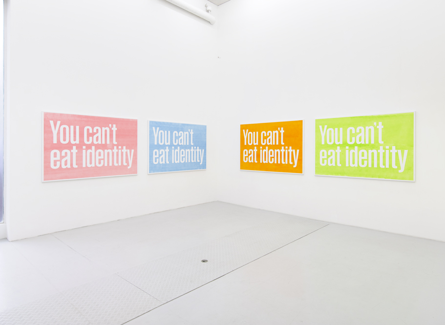In contrast, the exhibition’s second section addresses immigration without regional anchoring. Considering the universal concern of identity loss through assimilation, seven text paintings, a series bearing the same collective title as the exhibition, each read, “You can’t eat identity.” The bright Pop art-reminiscent hues of the paintings’ monochrome backgrounds are, in fact, the seven colors comprising Euro notes. This back-room installation serves a bleak, pithy warning that one risks one’s life to migrate to countries where survival can lead to invisibility.
