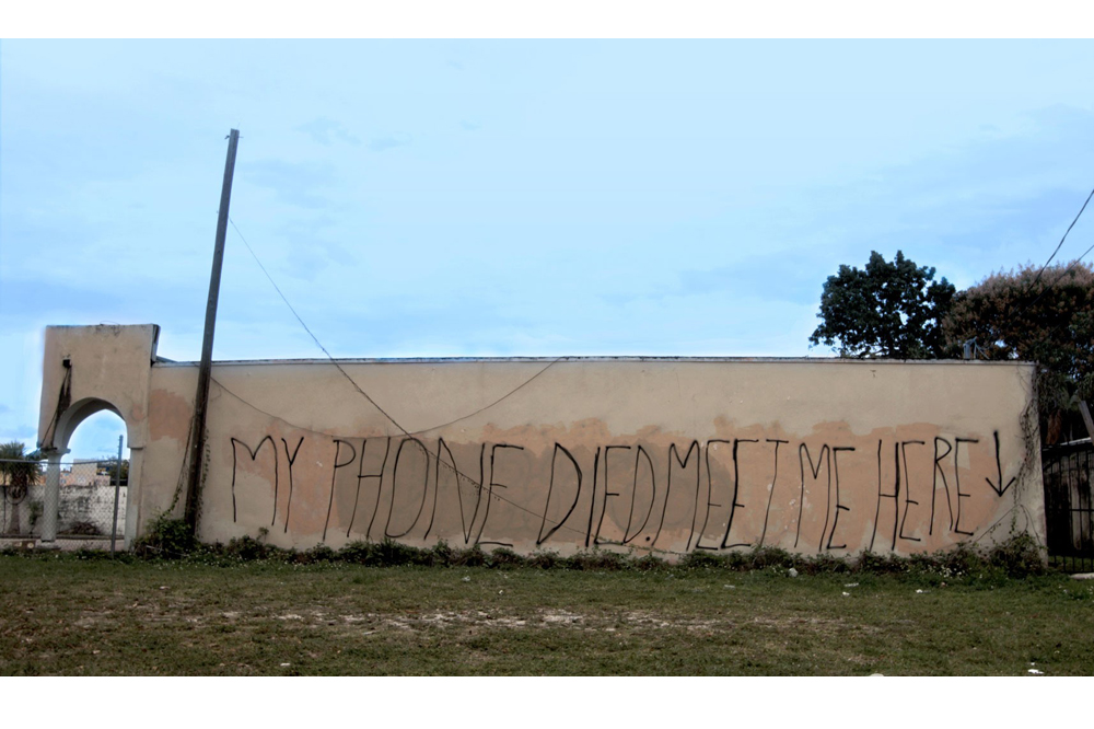 Entering the space, you encounter Jillian Mayer’s large-scale photograph, My Phone Died. Meet me here. (2015), which depicts the titular phrase spray-painted in giant letters on a detached outdoor wall, presumably in her native Miami. While the print (edition of 5) is nominally the piece, the image also circulates via Mayer’s own Instagram account and through the numerous people that encounter the actual message and post it to social media. It’s a virally optimized take on the conceptual one-liner that plays on our helpless dependence on digital connectivity.