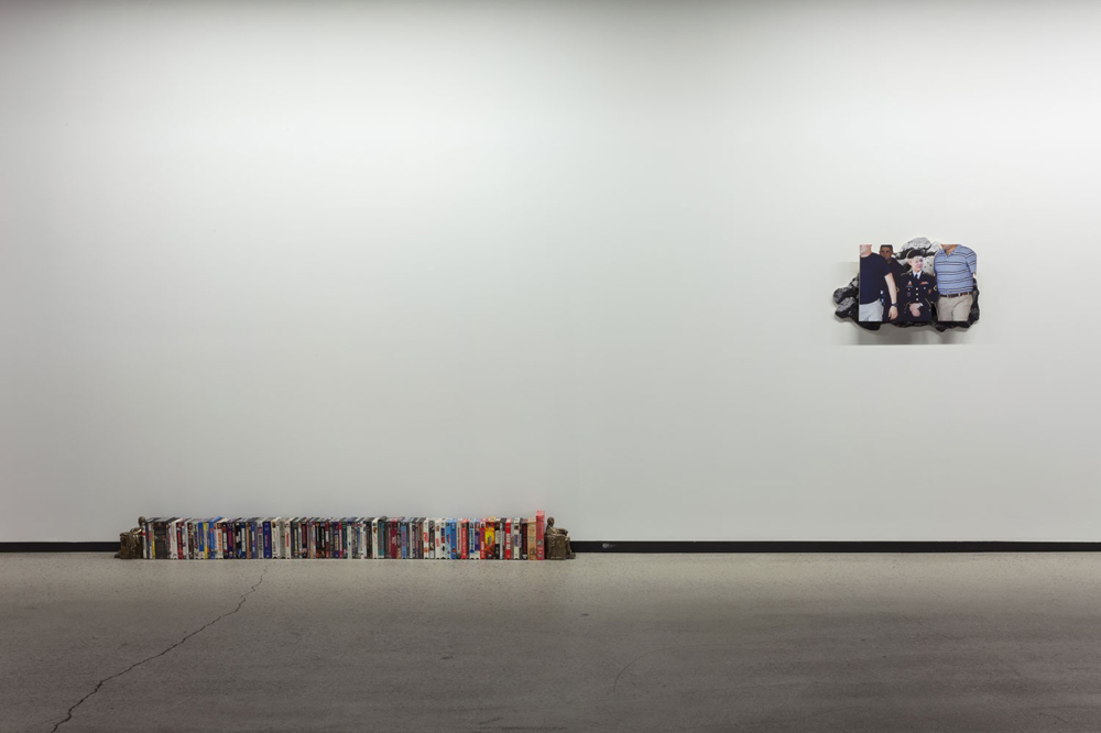 The third and final room feels a bit like a catch-all space for the remaining art (it’s where you can find paintings by Phillips and Musson, for instance), but a number of the works loosely cohere around the theme of film and television. There are two more Eric Yahnker pieces, both readymade sculptures rather than paintings. One is a collection of 92 VHS tapes that all have the word “American” in the title, bookended by brass Abe Lincoln statuettes. The other is a single VHS tape of the 1989 film Glory on a plinth, with a hole drilled through the center. The title? You guessed it: Glory Hole (2013). Slightly less boneheaded is Nick Demarco’s Miley Cyrus As Chelsea Manning (2015), a digital print on plywood from his series of fictional films constructed through sculptures and audio. A painting by Thea Govorchin titled The Power of Love (2014) combines an abstract form from Matisse’s cut-outs with a hentai nude, a pendant to a similar work near the gallery entryway with the truly offensive title Subservient Asian Afternoon Sandwich (2014), both of which call to mind this image by Instagram art satirist freeze_de.