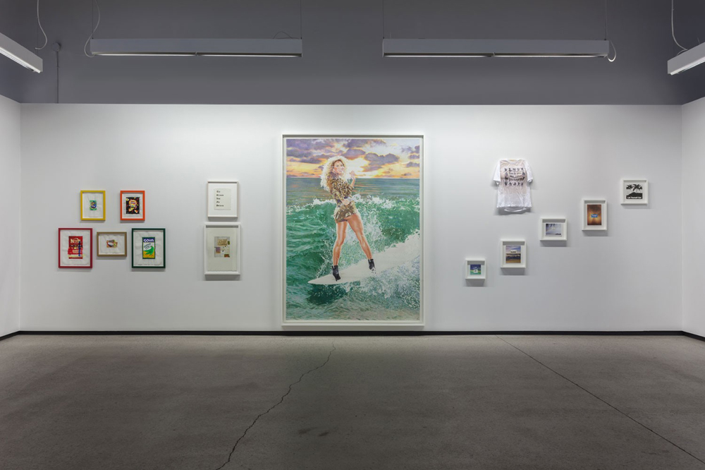 Leisure is more explicitly the theme of the exhibition’s second room, which is full of references to tourism and the beach – a blast of artificial sunshine in the midst of a Montreal winter. The room is dominated by Eric Yahnker’s monumental (and monumentally silly) Bey-watch (2014), a technically accomplished, life-size pencil crayon rendering of Beyoncé riding a surfboard into a sunset, wearing full gold lamé. Les Ramsay and Paul Butler are odd men out, in that their bodies of work have little to do with the exhibition’s overarching premise, but both contribute tropical-themed pieces here. From Butler, collages of beach scenes with slogans affixed (“DO IT”, “Let Yourself Go!”, etc.) ;from Ramsay, paintings that incorporate patchwork beach towels adorned with palm trees. There’s another Jillian Mayer piece, too – a video titled Hot Beach Babe Aims to Please (2014) in which the artist goes for a dip in the ocean trailed by a swarm of cursor arrows that prod at her body. She’s literal clickbait.