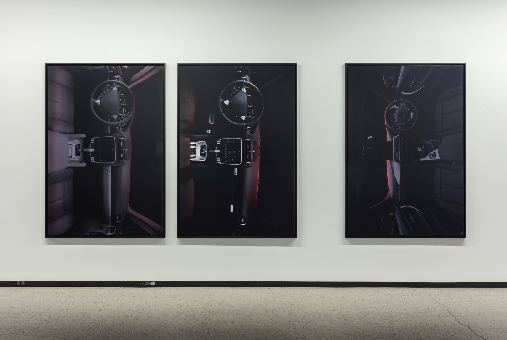 Three C-prints from Wyatt Niehaus’s Lights Out series (2014) hang on the opposite wall. The images are dimmed, red-hued renderings of luxury-car interiors taken from the factory floor; the absence of humans suggests the automation not only of manufacturing but of design, trend forecasting, and the production of desire itself. Niehaus imagines a post-industrial world of commodities circulating without the need for either producers or consumers.