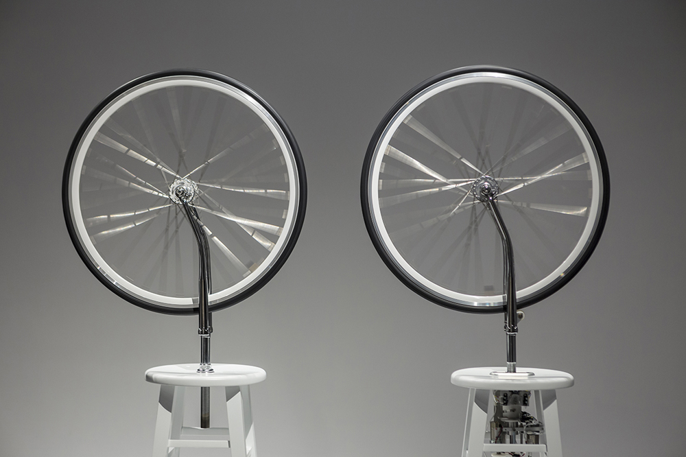 In thinking about kinetic sculpture and about his piece, I thought about how I would approach it [if I were to make it]. I was thinking about this idea of responding to male Modernist artists. I had wanted to bring women back into the context, so I put a Georgia O’Keeffe flower in the center of the bicycle seat, in the sweet spot. Then, when I was working on the large mobile in response to Man Ray, I was thinking about wanting to liberate the hangers, and how that’s a very female response, I thought: wanting to take care of the impasse, to cure the impasse, to want to let every piece within the mobile live freely. I started to think about it in a gendered way. They’re all performative, they’re all playful. However, the title with marcel is quite direct, this idea of nudging him to respond, or nudging him out of the way.
