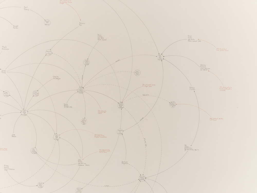 The show is divided, perhaps too neatly, into two complementary sections. Its first half focuses on artists that directly address political and social issues while drawing from the public record; the second half veers into more fantastical, speculative territory. The distinction here is meant to emphasize the difference between conspiracy – that is to say, real-life events that were initially met with skepticism and often later found to be true; and conspiracy theory, with its connotation of fabrication. Despite the exhibition’s claims to highlight ambiguity, the delineation between the complementary halves of the exhibition exposes an authoritative register: while certain histories are taken to be true at face value, others are relegated to conspiracy theory, but the calculus of this decision remains vague. In the first half, works like Mark Lombardi’s BCCI-ICIC & FAB, 1972-91 (4th Version) (1996-2000) meticulously trace connections between drug smugglers, politicians, and financiers. In his 1971 investigation of real estate moguls Sol Goldman and Alex Di Lorenzo’s use of shell corporations to obfuscate their holdings from tenants’ rights groups, Hans Haacke employed a similar forensic mode and display of evidence. When these works were initially exhibited, at the Whitney and the Guggenheim, respectively, they were confronted by the authoritarian infrastructures they critiqued: Lombardi’s show prompted a visit by the FBI to the Whitney, while Haacke’s solo show at the Guggenheim was cancelled and its curator fired. Evincing the potential for art to function as effective political critique, such works demonstrate how research-based practices were mobilized by the pervasiveness of corruption.